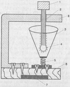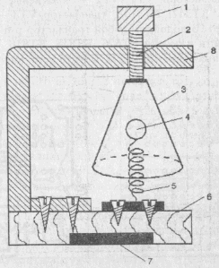 Рассмотрим конструкцию датчиков. В датчике подвижный контакт укреплен ни основании 6, представляющем собой изоляционный материал (гетинакс, кусок фанеры). К основанию лвумя шурупами прикреплена пружина 5. Жесткость пружины подбирается такой, чтобы в спокойном состоянии укрепленный на ней металлический шарик 4 (рис.6) или металлическая воронка 3 (рис.7) не отклонялись в сторону под действием своей массы.