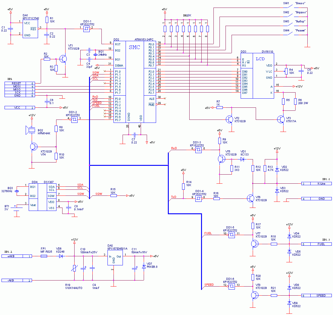 Преобразование уровней сигналов от датчиков скорости и расхода топлива в ТТЛ уровни осуществляет схема сопряжения, выполненная на транзисторах VT7 (датчик расхода топлива) и VT8 (датчик скорости). Формирование фронтов принимаемого от ЭБУ сигнала выполняют триггеры Шмитта DD1.5 и DD1.6. Для защиты входа "БК" от возможных выбросов напряжения положительной и отрицательной полярности, превышающих напряжение питания, служат диоды VD4, VD5, V8 и VD9. Для этих целей могут быть использованы любые маломощные импульсные диоды, типа КД510, КД511, КД522.