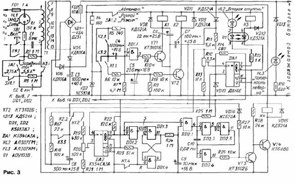 Допускается и работа в режиме ручного управления, при котором автолюбитель сам устанавливает зарядный ток и выключает устройство. Принцип действия основан на периодическом сравнении текущего напряжения на заряжаемой батарее с напряжением на ней часовой давности. В качестве узла хранения напряжения использован оксидный конденсатор с малым током утечки.