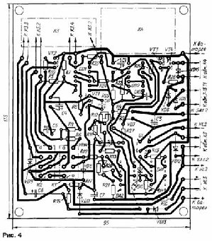 Большая часть деталей устройства размещена на печатной плате, выполненной из одностороннего фольгиро-ванного стеклотекстолита толщиной 1,5 мм. Чертеж платы изображен на рис. 4. Трансформатор Т1, конденсаторы С1, С2 с резисторами R2, R3 смонтированы отдельно, а переключатели SA1 и SA2, кнопка SB1, индикаторная лампа HL1 и светодиоды HL2, HL3 вынесены на лицевую панель коробки. В устройстве применен унифицированный накальный трансформатор ТН60-127/220-50, первичная обмотка которого рассчитана на напряжение 220 В. Вторичные обмотки соединены последовательно. Такое включение при напряжении на первичной обмотке 155 В [8, 9] обеспечивает на вторичной обмотке напряжение 16,9 В при максимальной нагрузке. Подойдут также трансформатор ТН58-127/220-50, включенный как предложено в [8], или более мощный ТН61-127/220-50. или ТПП284- 1 27/220 - 50, ТПП291 -127/220-50, вторичные обмотки которых соединены последовательно.