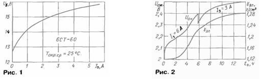 Изложенное иллюстрирует рис. 2, где изображены графики зависимости напряжения на аккумуляторе Uаk и плотности электролита узл батареи 6СТ-60 от времени зарядки tэ выполненной в соответствии с инструкцией по эксплуатации, т. е. сначала током 6 А, а затем — до полного заряда — током 3 А.