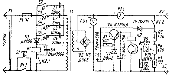 Детали. Резисторы типа МЛТ; переменный резистор R4 типаСП-1; транзисторы V8 типа КТ801А или КТ602, КТ603, П701, V9 типа МП37, КТ315, КТ312, КТ601...КТ603; измерительные приборы РА1 и PU1 типа М5-2, рассчитанные соответственно на 30 А и 30 В; реле К1 типа РС-13 (контакты /<7.7 образованы тремя параллельно соединенными группами контактов); диоды v2-v5 типов Д305, Д214, Д242 устанавливаются на радиаторы; конденсаторы С1-С4 типов МБГЧ, МБГО, МБГП, МБМ с рабочим напряжением 600 В или КБГ-ММ, МБГЧ-300 В, С5-С7 типов К50-3, К50-6, ЭГЦ; трансформатор Т1: обмотка i 320 витков провода ПЭВ-2 1,16 мм, обмотка ii 34 витка ПЭВ-2 2,46, сердечник Ш32 x 100; переключатели si-s5 типа ТВ2-1.