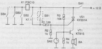 Работает данное устройство следующим образом. При включении выключателя SA1 на устройство поступает напряжение бортовой сети и подготавливаются к работе цепи электромагнитного реле К1, тиристора VS1 и транзистора VT1. При открывании любой двери салона, крышки капота или багажника замкнутся контакты выключателей SB2 — SBn и сработает реле К1 типа РЭС10 (паспорт РС4.524.302), которое своими контактами К1.1 подключит управляющий электрод тиристора VS1 через резистор R1 к плюсовому проводу источника питания, что приведет к открыванию тиристора. Если качнуть автомобиль, то замкнутся контакты датчика SB1 и питающее напряжение через резистор R1 также поступит на тиристор. Ток, протекающий через резисторы R1 и R2, создает на управляющем электроде тиристора VS1 положительное напряжение, которое открывает его.