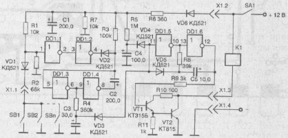 При замыкании любого контактного датчика SB1 — SBn на вывод 1 элемента DD1.1 через диод VD1 поступает нулевой потенциал. В результате на выводе 4 элемента DD1.2 появляется нулевой потенциал, что приводит к появлению на выводе 6 элемента DD1.3 микросхемы положительного потенциала, который через цепь задержки R4, СЗ поступает на катод диода VD3. Диод закрывается, что разрешает работу мультивибратора (DD1.5 и DD1.6). Цепь R4, СЗ формирует задержку срабатывания сигнализации на 5 с. Мультивибратор формирует прямоугольные импульсы с частотой следования 1 Гц, которые через резистор R9 поступают на ключ на транзисторах VT1 и VT2, в коллекторной цепи которого включена обмотка реле звукового сигнала К1 автомобиля. Время звучания сигнала определяется постоянной времени цепи R3, С2. После заряда конденсатора С2 (спустя примерно 20 с) па йыноде 11 мультивибратора (элемент DD1.5) устанавливается нулевой потенциал и он блокируется. Схема переходит в режим охраны. Если любой контактный датчик SB1 -SBn замкнут, то сигнал тревоги звучит постоянно.