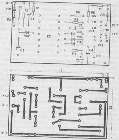 В устройстве вместо микросхемы К561ЛН2 можно использовать К564ЛН2 (при этом придется изменить рисунок печатной платы). Транзистор КТ315 можно заменить на КТ342, КТЗЮ2, а КТ815 - на КТ817 или КТ819. Емкости всех конденсаторов могут отличаться на ±50% от номиналов, приведенных на схеме, однако это изменит выбранные временные интервалы. Их можно скорректировать подбором соответствующих резисторов. Желательно использовать электролитические конденсаторы с рабочим напряжением 16 В и небольшим током утечки, особенно это важно для конденсаторов С2 н С4, которые при значительной емкости работают в паре с высокоомными резисторами. В противном случае большой ток утечки может сделать схему неработоспособной.