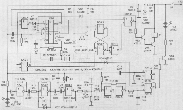 В состав автосторожа входит пульт дистанционного управления на инфракрасных светодиодах типа АЛ107Б, выполненный по известной схеме. Также в состав автосторожа включена часовая микросхема К176ИЕ12 и кварцевый резонатор Q1 с частотой 32768 Гц для формирования временных интервалов.