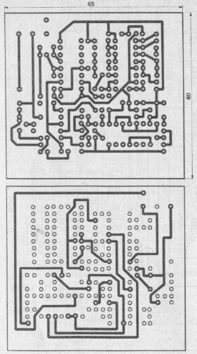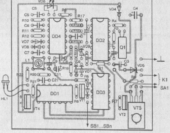Печатная плата автосторожа приведена на рис.4. Катушка L1 намотана на сердечнике СБР-23 и содержит в зависимости от частоты от 100 до 500 витков (от 16 кГц до 5 кГц, соответственно) провода ПЭВ-1 0,1 мм. Для питания микросхем в схеме используется стабилитрон VD5 типа КС210 с напряжением стабилизации 10В.