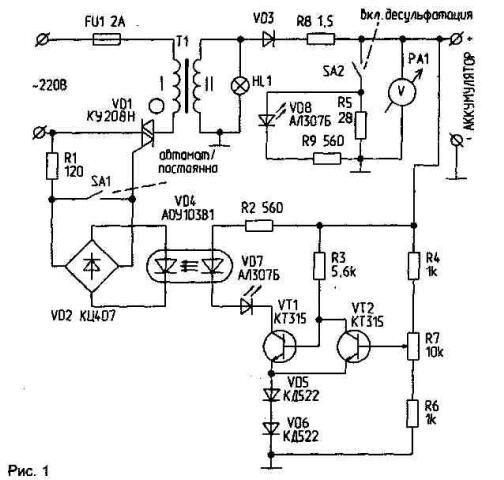 Напряжение сети 220 В подается через предохранитель FU1 и симис-тор VD1 на первичную обмотку силового трансформатора. Со вторичной обмотки переменное напряжение U2=21 В выпрямляется диодом VD3 и через балластный резистор R8 сопротивлением 1,5 Ом поступает на клемму "+" батареи, к которой подключены вольтметр РА1 на 15 В, тумблер SA2 "ВКЛ.ДЕСУЛЬФАТА-ЦИЯ" и схема контроля и управления, представляющая собой триггер Шмитта с гистерезистором около 1,8 В, определяемым падением напряжения на диодах VD5, VD6 и переходе база-эмиттер транзистора VT2. Транзистор VT1 при напряжении на аккумуляторе 12,6 В включается, и через оптрон VD4 включает симистор VD1, что приводит к включению трансформатора Т1 и подаче напряжения на заряжаемый аккумулятор.