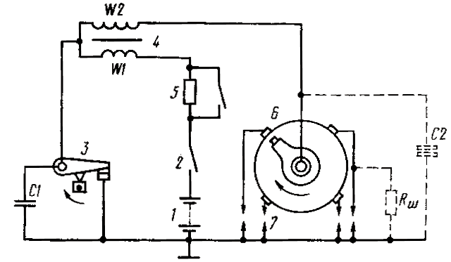 Конструктивно прерыватель тока 3 объединен с высоковольтным распределителем 6 в единый прибор - распределитель зажигания, на корпусе которого обычно установлен и искрогасительный конденсатор С1. Кулачок прерывателя и ротор распределителя расположены на общем валике, который вращается в два раза медленнее коленчатого вала двигателя *.