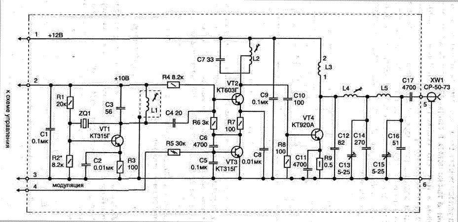 Радиопередатчик Для работы охранных устройств с оповещением по радиоканалу Государственным комитетом по радиочастотам выделена фиксированная частота 26,945 МГц. А чтобы обеспечить для передатчика ее высокую стабильность в широком температурном диапазоне (-40...+60°С), необходимо использовать кварцевую стабилизацию частоты. Передатчик собран по классической схеме, рис. 2.51. Высокочастотный сигнал с автогенератора на транзисторе VT1 через промежуточный усилитель на VT2 подается на оконечный усилитель VT4. У промежуточного усилителя коллекторный контур настраивается с помощью сердечника катушки L2 на первую гармонику задающего генератора. Катушка L2 имеет неполное включение, что увеличивает добротность контура. Усилитель на VT2 позволяет уменьшить влияние изменения режима оконечного каскада на работу задающего автогенератора, а также обеспечивает достаточный уровень сигнала для работы усилителя мощности. Рис. 2.51. Электрическая схема высокочастотной части передатчика Оконечный усилитель: работает в режиме класса С. Ключевой