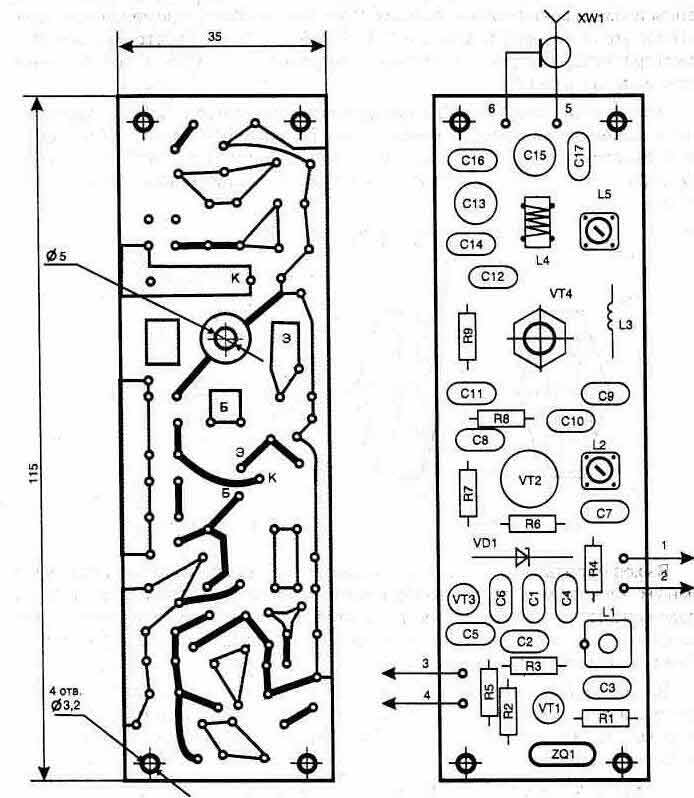 Выход передатчика соединяется с антенной высокочастотным кабелем с 50-омным "волновым сопротивлением через разъем XW1. Вблизи от антенны расположено согласующее устройство, состоящее из катушки L6 (в экране). Длина соединительного кабеля от согласующего устройства до основного блока составляет 1,64 м или кратна этому значению (3,28 м). Все остальные элементы высокочастотной части схемы располагаются на печатной плате из одностороннего стеклотекстолита толщиной 1,5...2 мм с размерами 115х35 мм, рис. 2.53, которая помещается в экранированном отсеке корпуса блока охраны. В схеме применены детали: резисторы типа С2-23, постоянные конденсаторы К10-17, при этом СЗ...С7, С12, С14 и С16 выбираются с минимальным ТКЕ (М75, М47, МЗЗ), подстроечные С13 и С15 типа К4-236 или К4-216. Использован кварцевый резонатор РК169МВ-14ЕП-26945К-В. Катушки выполняются на диэлектрических каркасах диаметром 5 мм, и их вид показан для L1, L2 и L4 на рис. 2.54. Катушка L5 должна иметь конструкцию, которая обеспечивает её горизонтальное расположение на плате (рис. 2.55) (это снижает влияние полей близко расположенных катушек друг на друга). Намотка выполняется виток к витку проводом ПЭТВ-2 или ПЭЛ-2: L1 содержит 14 витков проводом диаметром 0,23 мм; L2 — 14 витков с отводом от середины, L4 — 10 витков, L5 — 10 витков проводом диаметром 0,42 мм. Рис. 2.53. Топология печатной платы и