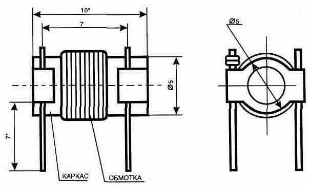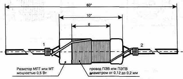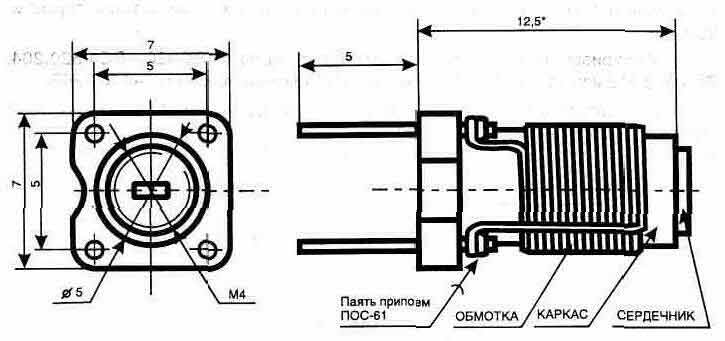 расположение элементов высокочастотной Рис. 2.54. Конструкция катушки Pис. 2.55. Конструкция катушки Подстроечные сердечники могут быть из любого высокочастотного феррита с резьбой М4. Катушка дросселя L3, рис. 2.56, выполняется проводом диаметром 0,12 мм на корпусе резистора МЛТ-0,5 с сопротивлением 1...1.8 кОм и содержит 50 витков. После намотки у всех катушек провод фиксируется клеем "Момент", БФ-4. А для того чтобы сердечники катушек от вибрации при эксплуатации системы в жестких условиях не смещались, их до вкручивания в каркас катушки смазываем несохнущим вязким герметиком. Поляризованное реле К.1 подойдет типа РЭС32Б РС4.520.204, РС4.520.212 или РС4.520.220. Транзистор VT4 можно заменить на КТ925Б. На корпусе передатчика устанавливается высокочастотное гнездо XW1 (розетка приборная) типа СР-50-73Ф ГУ3.640.073Сп, а на кабеле от согласующего с антенной устройства — вилка кабельная СР-50-74Ф ГУ3.640.706Сп. Рис. 2.56. Конструкция дросселя L3