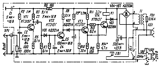 При снижении сигнала на базе транзистора VT2 ниже определенного уровня (устанавливается резистором R1) он закрывается. Вслед за ним закрывается диод и конденсатор С5 начинает заряжаться. Если через 1...2 мин, в течение которых конденсатор C5 зарядится до напряжения, достаточного для открывания транзистора VT3, сигнал не появится - автомат отключит аппарат от сети. Появление же входного сигнала практически мгновенно прекратит зарядку конденсатора, он начнет разряжаться через диод VD2 и транзистор VT2, и отключения аппарата от сети не произойдет.