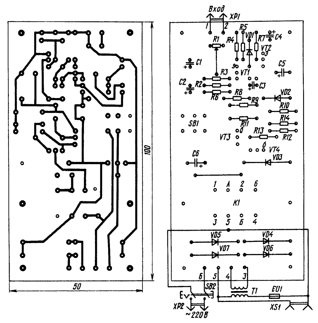 Автоматический выключатель собран на печатной плате из фольгированного стеклотекстолита. Для монтажа использованы резисторы МЛТ-0,125, конденсаторы К50-16 (можно К50-6 и К50-3), реле РЭН-34, паспорт ХП4.500.030-01 (или РЭН-18 на рабочее напряжение 12 В и ток срабатывания 30...50 мА), кнопка SB1 - П2К без фиксации (для облегчения тонового режима переключателя 2-3 группы его контактов следует запараллелить) или КМ-2, SB2 - ПКн-41 или МТ-3. В качестве трансформатора Т1 можно использовать ТП8-3, ТВК-70, ТП20-17, ТП45-1 или любой другой с напряжением на вторичной обмотке 10...12 В при токе не менее 100 мА.