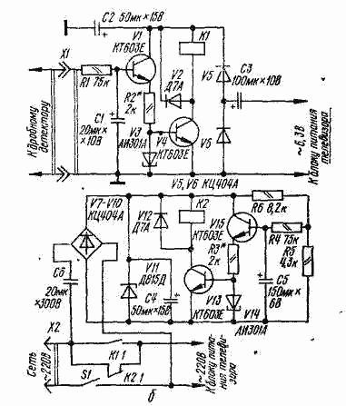Когда телевизор выключен, контакты К1.1 разомкнуты, а контакты К2.1 замкнуты. При включении телевизора (выключателем S1) напряжение сети поступает в его блок питания через контакты К2.1. Напряжение 6,3 В с трансформатора питания (накал ламп телевизора) выпрямляется диодами V5 и V6 (включены по схеме удвоения).