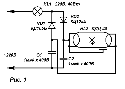 Конструктивное исполнение светильника не вызывает затруднений. Диоды и конденсаторы выпрямителя имеют малые габариты и легко размещаются в том месте, где обычно находится дроссель. Патрон для лампы накаливания можно установить в отверстие, предназначенное для установки стартера. Ободок поджига выполняется из фольги шириной 50 мм и приклеивается к баллону лампы клеем БФ-2.