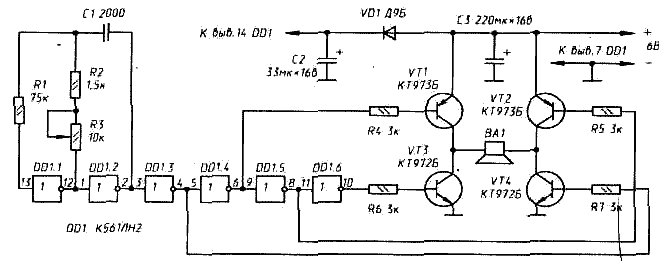 F@1/2(R2+R3)C1,.подключая излучатель ВА1 к источнику питания. В одном полупериоде - через открытые транзисторы VT1 и VT4, в другом - через VT2 и VT3.