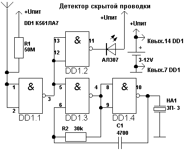 Таким устройством очень удобно определять местоположение перегоревшей лампы в елочной гирлянде - возле нее треск прекращается. Пьезоизлучатель типа ЗП-3 включен по мостовой схеме, что обеспечивает повышенную громкость "треска". На рис.2 изображен более сложный детектор, имеющий, кроме звуковой. еще и световую индикацию. Сопротивление резистора R1 должно быть не менее 50 МОм. В цепи светодиода VD1 токоограничивающего резистора нет. так как микросхема DD1 (К561ЛА7) с этой функцией хорошо справляется сама. Если входные токи элемента D1.1 позволяют, то убрав резистор R1 из схемы, изображенной на рис.2, мы получим устройство, реагирующее на изменение статического потенциала в окружающем пространстве. Для этого антенну WA1 делают длиной 50...100 см. используя любой провод. Теперь устройство будет реагировать на движение человеческого тела. Положив такое устройство в сумку, получим автономное охранное устройство, выдающее световые и звуковые сигналы, если с сумкой или около нее происходят какие-либо манипуляции.