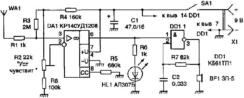 Схема прибора приведена на рис. 1. Он состоит из двух узлов - усилителя напряжения переменного тока, основой которого служит микромощный операционный усилитель DA1, и генератора колебаний звуковой частоты, собранного на инвертирующем триггере Шмитта DD1.1 микросхемы К561ТЛ1, частотозадающей цепи R7C2 и пьезоизлучателе BF1.