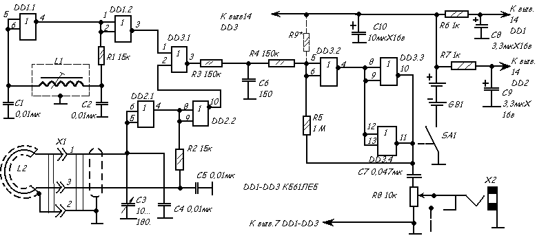 Микросхемы DD1 и DD2 металлоискателя питаются от источника постоянного тока GB1 через развязывающие фильтры R6C8 и R7C9.
