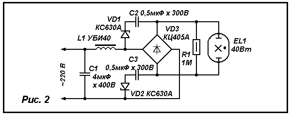 Вот, к примеру, устройство, рассчитанное на питание лампы мощностью до 40 Вт (рис. 2). Работает оно так. Сетевое напряжение подается через дроссель L1 на мостовой выпрямитель VD3. В один из полупериодов сетевого напряжения конденсатор С2 заряжается через стабилитрон VD1, а конденсатор СЗ - через стабилитрон VD2. В течение следующего полупериода напряжение сети суммируется с напряжением на этих конденсаторах, в результате чего лампа ЕL1 зажигается. После этого указанные конденсаторы быстро разряжаются через стабилитроны и диоды моста и в дальнейшем не оказывают влияния на работу устройства, поскольку не в состоянии заряжаться - ведь амплитудное напряжение сети меньше суммарного напряжения стабилизации стабилитронов и падения напряжения на лампе.
