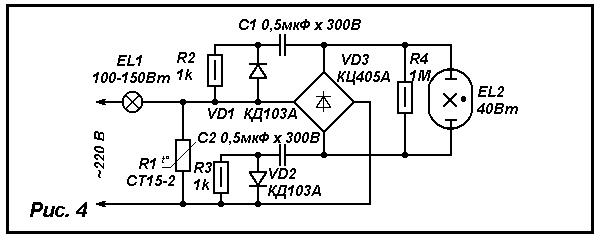 Дроссель, служащий балластным сопротивлением, не обязателен в рассматриваемых устройствах питания и может быть заменен лампой накаливания, как это показано на рис. 4. При включении устройства в сеть происходит разогрев лампы EL1 и терморезистора R1. Переменное напряжение на входе диодного моста VD3 возрастает. Конденсаторы С1 и С2 заряжаются через резисторы R2, R3. Когда суммарное напряжение на них достигнет напряжения зажигания лампы EL2, произойдет быстрая разрядка конденсаторов - этому способствуют диоды VD1,VD2.