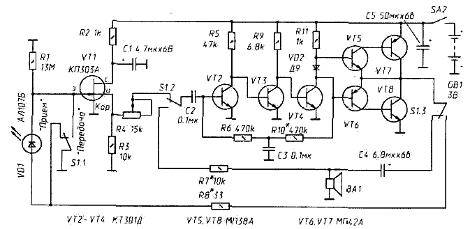 Выходной каскад усилителя, выполненный на транзисторах VT5-VT8, обеспечивает раскачку динамической головки ВА1 на приеме и достаточную амплитуду колебаний тока в ИК диоде в режиме передачи. При переходе на передачу (переключатель S1 на рис. 129 показан в положении «прием») динамическая головка подключается ко входу усилителя и используется в качестве микрофона. Усиленный в тракте VT2-VT8 сигнал вводится в ИК диод в виде тока звуковой частоты. Его уровень будет зависеть, очевидно, от напряжения на выходе усилителя и сопротивления резистора R8. Излучение ИК диода линейно связано с этим током и будет отслеживать его даже на самых высоких телефонных частотах (ИК диоды обладают достаточно высоким быстродействием).