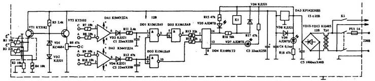 Схема достаточно проста и не содержит особо дефицитных деталей. При некотором ухудшении параметров она может быть собрана практически из любых имеющихся деталей. Питание для терморегулятора поступает от сети 220 В через трансформатор со вторичной обмоткой, рассчитанной на 12 В и мощность 10 Вт. Выпрямитель применен мостового типа, лучше КЦ405, но подойдет и любой другой.