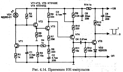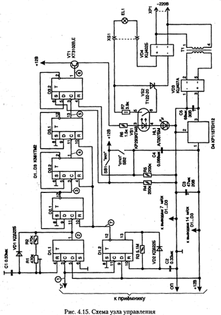 Устройство состоит из приемника ИК-импульсов, рис. 4.14, и блока управления, рис. 4.15. В качестве приемника можно взять любую из типовых схем, применяемых в телевизорах для ДУ. Узел управления собран на трёх КМОП микросхемах и состоит из формирователя широких импульсов (D1.1), селектора двухсекундного временного интервала (D1.2) и двоичных счетчиков на элементах триггеров D2...D3. Кнопки SB1 и SB2 позволяют включать и выключать нагрузку без пульта ДУ.