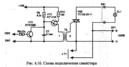 Вместо оптрона оконечный каскад управления лампой можно выполнять на обычном симисторе по схеме, показанной на рис. 4.16.