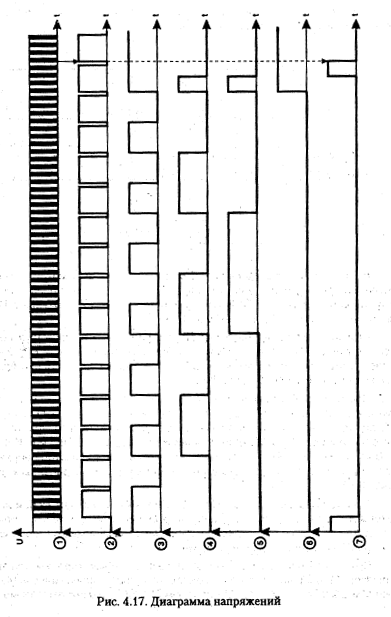 На рис, 4.17 приведены диаграммы напряжений в контрольных точках, поясняющие работу блока управления. В начальный момент подачи питания на схему, цепь из элементов C4-R5 обеспечивает установку триггера в D3.2 в исходное состояние (лог. "0" на выходе 1).