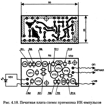 Конструктивно все устройство собрано в корпусе с размерами 110x88x44 мм. Печатная плата приемника ИК-импульсов, рис. 4.18, помещается в экран из медной фольги, что необходимо для исключения влияния помех. Для монтажа схемы блока управления использована универсальная макетная плата, а соединения выполнялись проводами.