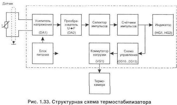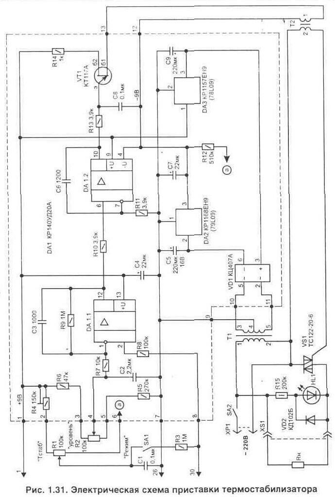 Нередко в быту требуется поддерживать заданную температуру в ограниченном объеме пространства. Это может быть аквариум, хранилище продуктов, инкубатор, сушильный шкаф или подогреватель детского питания. Удобно, если при работе такого устройства будет еще и цифровая индикация фактической температуры. Вашему вниманию предлагается два варианта выполнения автоматических устройств для поддержания заданной температуры. Термостабилизатор с использованием микросхемы КР572ПВ5В литературе [Л10, Л11] опубликованы простые схемы цифровых измерителей температуры, выполненные на основе микросхемы аналого-цифрового преобразователя (АЦП) КР572ПВ5 и цифровом жидкокристаллическом индикаторе ИЖЦ5-4/8. Эта микросхема изготовлена по МОП технологии и все устройство вместе с индикатором от источника питания (9 В) потребляет ток не более 2 мА. Такой измеритель температуры не сложно превратить в термостабилизатор. Для этого потребуется подключить к указанным выше устройствам схему управления нагревательным элементом, как это показано на рис. 1.30. Методика изготовления и настройки непосредственно измерителя температуры подробно приводится в указанной выше литературе и поэтому здесь описываться не будет. Рассмотрим более подробно только электрическую схему приставки термостабилизатора (рис. 1.31). Ее принцип работы основан на том, что порог переключения исполнительного устройства (электронного коммутатора напряжения в нагрузке) устанавливается по показаниям цифрового индикатора, имеющегося в измерителе температуры. Фактически микросхема (КР572ПВ5) является цифровым вольтметром, который измеряет напряжение, поступающее с термо-