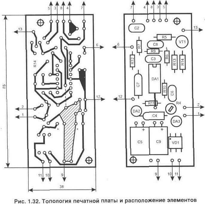 датчика (в данном случае датчиком является диод) на вход АЦП (вывод 30 микросхемы). Этот же сигнал подается в схему управления - на вход операционного усилителя DA1.1 и компаратор DA1.2. Применение в качестве компаратора схемы интегратора (за счет включения емкости С6) позволяет обеспечить плавный выход на режим термостабилизации. Это хорошо видно при подключении параллельно с нагревателем лампы. По мере приближения температуры к заданному значению яркость ее свечения будет постепенно снижаться. Работает схема приставки следующим образом. Положительное напряжение на выходе микросхемы DA1/10 разрешает работу автогенератора, собранного на однопереходном транзисторе VT1. Коммутацию нагревателя выполняет симистор VS1 при появлении на его управляющем выводе импульсов. Для того чтобы заранее точно установить для поддержания любую нужную температуру, служит переключатель SA1 ("режим") и регулировочные резисторы R1 и R2. Переключатель в положении, когда его контакты замкнуты, позволяет через резистор R1 подавать напряжение одновременно на входы микросхемы DA1/2 и на АЦП, имитируя изменение температуры термодатчика. При помощи резистора R1 можно установить любые условные значения на индикаторе от -4 до +100°С. Как только показание цифрового индикатора будет соответствовать необходимому для режима термостабилизации - вторым подстроенным резистором (R2) выставляем порог переключения компаратора DA1.2 на данной температуре. Индикатором наличия напряжения на нагрузке является светодиод HL1. Светодиод должен гаснуть при превышении входной температуры указанного порога, т.е. когда нагреватель отключится. На этом установку режима термостабилизации можно считать законченной и переключатель SA1 возвращаем в исходное положение (контакты разомкнуты). Элементы, выделенные на электрической схеме пунктиром, располагаются на печатной плате из стеклотекстопита с размерами 85х38 мм, рис. 1.32. Плата имеет одну объемную перемычку (показана пунктиром) и ее надо установить до начала монтажа. Для удобства настройки нужной температуры в схеме приставки использованы многооборотные подстроечные резисторы R1, R2 из серии СП--36: R4 - типа СП--19а, остальные типа С2-23 или МЛТ: конденсаторы С1...С- и С6, С8 - К10-17; полярные конденсаторы С4, С5, С7, С9 типа К50-35 на 16 В. Микросхема усилителя DA1 может быть заменена импортным аналогом А747; стабилизаторы напряжения DA2 на 79L09; DA3 на 78L09. Сетевой трансформатор (Т1) для питания схемы подойдет любой мощностью 3...5 Вт с напряжениями во вторичных обмотках 3-4 и 4-5 по 10...12 В и допустимым рабочим током до 50...80 мА. Импульсный трансформатор (Т2) можно использовать такой же, как и в схеме, показанной на рис. 1.17. Блок питания термостабилизатора удобнее выполнять в виде отдельного узла, где располагается и силовой коммутатор VS1. Калибровку показаний измерителя температуры необходимо выполнять при подключенной схеме приставки, что исключит погрешность, связанную с влиянием входной цепи и емкости монтажа приставки. При правильном монтаже настройка схемы приставки заключается в проверке полного открывания симистора VS1 при работе автогенератора на VT1 (может потребоваться поменять местами отводы в любой из обмоток трансформатора Т2). Для того чтобы регулятор перекрывал необходимый диапазон температур, нужно подстроить резистор R4. В заключение можно отметить, что этот ме