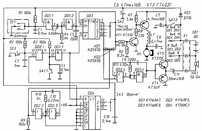 Элементы DD1.1, DD1.2, С2, R4 составляют одновибратор, устраняющий ложный счет в DD3 - в счетчике «поклевок» - от «дребезга» контактов датчика SF1. На элементах DD2.2, DD2.3 собран генератор тактовых импульсов, следующих с частотой 1 Гц. Счетчиком DD4, суммирующим эти импульсы, задается время активного состояния автомата. Сброс счетчиков, возврат автомата в исходное состояние - состояние ожидания - осуществляется импульсами «единичной» амплитуды, формируемыми элементами DD2.1 и DD1.3. Это происходит либо по окончании активного времени (при появлении напряжения высокого уровня на движке переключателя SA3), либо в начале подсечки (при разрыве контактов SF2), либо при ручном выключении автомата тумблером SA1 - замыкании контактной пары SA1.1.