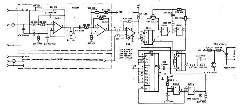 Выход первого канала подключен к инвертирующему входу компаратора DA2, а выход второго ≈ к неинвертирующему входу. Таким образом, шумовые сигналы с одинаковой амплитудой и фазой на выходах обоих каналов компаратором DA2 не регистрируются. Превышение сигнала в одном из каналов приводит к появлению уровня лог."1" на выходе 9 триггера DD1.1, при этом запускается генератор на DD3.1, DD3.2, VT4 и счетчик DD2 начинает отсчитывать импульсы. В то же время лог."О" на выводе 8 DD1.1 устанавливает в "О" выход 6 DD1.2, закрывается транзистор VT5, открывая тиристор VD2, который и включает освещение.