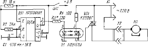 Работает это устройство следующим образом. При подаче питания на микросхему DD1 начинает заряжаться конденсатор С1 и в результате на выводе 3 DD1 появляется напряжение, близкое к напряжению питания. По окончании зарядки С1 внутри микросхемы DD1 открывается транзистор, связывающий ее седьмой и первый выводы, вследствие чего конденсатор С1 разряжается через резистор R2. После этого цикл работы прибора повторяется. Напряжение, близкое к напряжению питания, периодически возникающее на выходе микросхемы DD1, через токоограничивающий резистор R3 поступает на светодиод, находящийся в управляющей цепи оптрона U1. Под влиянием излучаемой им световой энергии входящий в состав оптрона симистор переходит в проводящее состояние и открывающийся вследствие этого силовой симистор VS1 включает двигатель М1. Важнейшая функция оптрона, рассчитанного на напряжение между входной и выходной цепью около 1500 В ≈надежная электрическая изоляция входной и выходной цепей. До появления подобных электронных узлов задачу разделения цепей решали с помощью громоздких электромагнитных реле. Тринистор VS1 с двусторонней проводимостью открывается с началом каждого полупериода сетевого напряжения, пока присутствует сигнал на выходе микросхемы DD1 и горит светодиод оптрона. Мощность управляемой нагрузки определяется допустимой величиной тока симистора VS1. Сама микросхема DD1 и светодиод оптрона при напряжении питания 6 В потребляет ток порядка 8... 12 мА, поэтому для их питания могут использоваться даже гальванические элементы LR6 (зарубежный стандарт АА).