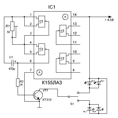 Простейший указатель поворотов можно собрать на двух элементах 2И-НЕ микросхемы К155ЛА3 или К155ЛА8 (см. схему). Входы её элементов соединены между собой так, что они образуют двухкаскадный усилитель, а электролитический конденсатор С1, включённый между двумя элементами микросхемы, и подстроечный резистор R1 превратят его в мультивибратор с частотой колебаний 1-2 Гц. С выхода второго элемента импульсы поступают на базу транзистора VT1 и открывают его. Таким образом, транзистор работает в ключевом режиме и периодически зажигает два светодиода правой или левой стороны. Переключать светодиоды лучше всего трёхпозиционным переключателем (тумблером).