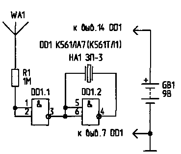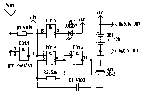 В цепи светодиода VD1 токоограничивающего резистора нет. так как микросхема DD1 (К561ЛА7) с этой функцией хорошо справляется сама. Если входные токи элемента D 1.1 позволяют, то убрав резистор R1 из схемы, изображенной на рис.2, мы получим устройство, реагирующее на изменение статического потенциала в окружающем пространстве. Для этого антенну WA1 делают длиной 50...100 см. используя любой провод. Теперь устройство будет реагировать на движение человеческого тела. Положив такое устройство в сумку, получим автономное охранное устройство, выдающее световые и звуковые сигналы, если с сумкой или около нее происходят какие-либо манипуляции.