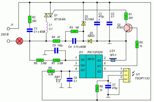 основе схемы лежит микроконтроллер фирмы Microchip PIC12F629 . Задача микроконтроллера обработка сигналов поступающих с кнопки управления SW1 и от инфракрасного датчика U2 и управление симистором.