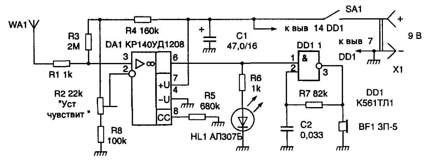 При расположении антенны WA1 вблизи от токонесущего провода электросети наводка ЭДС промышленной частоты 50 Гц усиливается микросхемой DA1, в результате чего зажигается светодиод HL1. Это же выходное напряжение операционного усилителя, пульсирующее с частотой 50 Гц, запускает генератор звуковой частоты.