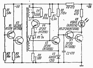 Металлоискатель состоит из параллельного стабилизатора напряжения (транзисторы VI, V2), генератора высокой (около 100 кГц) частоты на транзисторе V4, детектора ВЧ колебаний (V5) и усилителя постоянного тока (V6, V7) с индикатором на светодиоде V8.