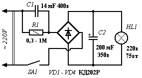 Схему удобно разместить в корпусе торшера или светильника, если в них есть свободные пространства. При подаче напряжения конденсатор C2 заряжается в течение 0,4...1 секунды ( в зависимости от ёмкости С2 ) т.е. нить накала лампы разогревается плавно и сгореть от броска тока не может. VD1 - VD4 можно заменить на КД206Б, КД210Б, КД243Д, КД209Б, Д247. С2 - 100...330 мF на напряжение 350...400 в. С1 на напряжение не менее 300 в и подбирается экспериментально в зависимости от мощности лампы накаливания.