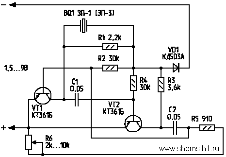 Рассмотрим работу устройства. Диод VD1 необходим для защиты от неправильного подключения питания к схеме. Питается устройство от гальванических элементов +1,5 В (напряжение питания можно повышать до +9 В). С увеличением напряжения возрастает мощность излучения устройства. Звуковоспроизводящим элементом устройства служит пьезоизлучатель ЗП-1 (ЗП-3, ЗП-22) или любой другой, например от наручных часов. Резисторы R2...R4 и R5, R6 задают рабочую точку транзистора VT1 и VT2. При подаче напряжения на VT1 заряжается С1, импульс с С1 кратковременно открывает VT2, VT2 заряжает С2, который кратковременно открывает VT1, и цикл работы повторяется снова. Частота генератора зависит от величин емкостей С1 и С2 и сопротивления R6. Можно последовательно с BQ1 включить еще несколько излучателей, тогда выходная мощность увеличится.