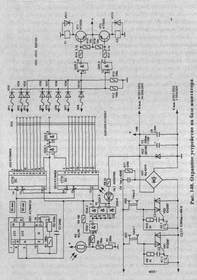Схема охранного устройства показана на рис. 140. Поскольку большинство несанкционированных проникновении в дачных кооперативах совершаются в темное время суток, устройство управляет включением нагрузок именно в это время. На микросхеме DD1 выполнен генератор импульсов с частотой следования 30 мин. Для этого использованы элементы собственно генератора микросхемы (выводы 12 -14) и счетчики-делители (выводы 5, 6, 7, 9, 10). На микросхемах DD2, DD3 выполнены два декадных счетчика. На микросхеме DD4 и фоторезисторе R3 собрано фотореле. Диоды VD3 - VD10 совместно с логическими элементами DD5.3, DD5.4 позволяют программировать время включения и выключения нагрузок, подключаемых к гнездам XS1, XS2. Нагрузки подключаются к сети с помощью симисторов VS1 и VS2, управляемых контактами электромагнитных реле К1 и К2. Источник питания микросхем и реле собран по традиционной схеме с гашением излишнего напряжения конденсатором, в нем задействованы элементы С4, R 11. VD1, VD2, С 5.