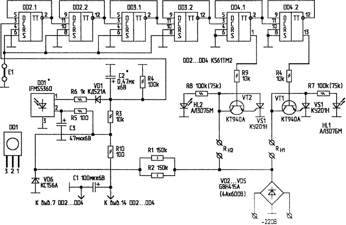 Конструктивно устройство размещается в корпусе, изготовленном из полупрозрачной мыльницы. Вместо ИМС К561ТМ2 подойдут К176ТМ2, 564ТМ2. Фотоприемник IFMS5360 производства НПО "Интеграл" можно заменить на TFMS5360, TFMS5380 фирмы Philips. Импортный диодный мост GBH415A заменять допускается лишь на диоды с номинальным током не менее 4 А и обратным напряжением не ниже 400 В (например, КД202Р). Единственным недостатком устройства является невозможность включения его в разрыв провода питания лампы, вместо штатного выключателя. Однако это не вызывает существенных неудобств при его установке вблизи разветвительной коробки, в которой соединяются провода, идущие к выключателю и люстре. Схема имеет бестрансформаторное питание от сети, поэтому при наладке следует соблюдать осторожность. Лучше всего проверить схему (без силовой части), подключив ее к источнику питания напряжением 5...6 В. Знак "корпус" на схеме показан для упрощения графики. Соединять его с землей ни в коем случае нельзя!