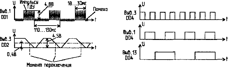 На элементах D2.1...D3.2 собран делитель частоты на 16 (24), что обеспечивает помехоустойчивость устройства за счет введения задержки переключения примерно на 3 с. Последовательно включенные триггеры D4.1 и D4.2 обеспечивают переключение ламп, включенных в клеммы "RH1" и "RH2" по алгоритму: RH1≈RH1 + RH2≈RН2 ≈ все погашены (и дальше по кольцу). Временные диаграммы работы устройства приведены на рис.2.