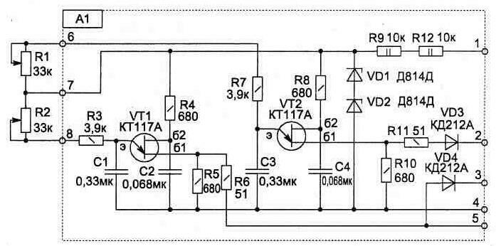 Электрическая схема блока управления (рис. 6.14) собрана на однопереходных транзисторах и является типовой. Коммутация нагрузки производится с помощью мощных тиристоров VS1 и VS2. Элементы схемы выбраны со значительным запасом по рабочему току, с учетом возможного их размещения (без радиатора) вблизи от нагревательных элементов.