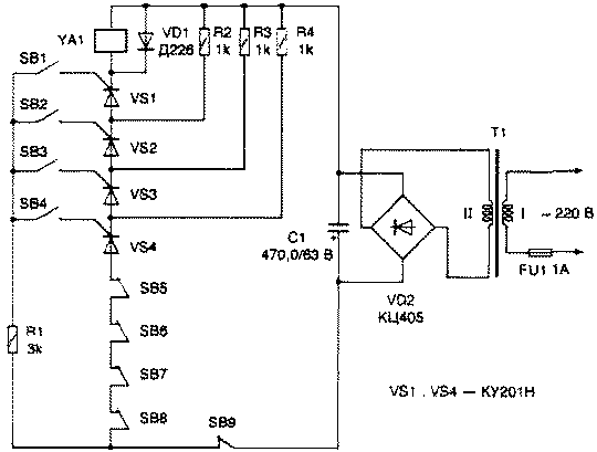 Замок срабатывает только при одновременном открывании всех тиристоров VS1≈VS4. Добиться этого можно последовательным нажатием кнопок SB4, SB3, SB2 и SB1. При другой последовательности нажатия этих кнопок не все тиристоры будут открыты и, следовательно, открыть дверь не удастся. Исключение составляет случай, когда одновременно нажаты все четыре кнопки SB1≈ SB4. В случае нажатия на любую из кнопок SB5≈SB8 цепь питания электромагнита YA1 обрывается и устройство приводится в исходное состояние. Тоже произойдет и при нажатии всех кодовых кнопок SB1≈SB8. Кнопка SB9 служит для приведения замка в исходное состояние после открывания двери. Замок питается от сети переменного тока напряжением 220 В через трансформатор Т1 и двухполупериодный выпрямитель VD2. Для питания замка может быть использован любой блок питания с выходным напряжением 12≈60 В, в зависимости от типа используемого электромагнита.