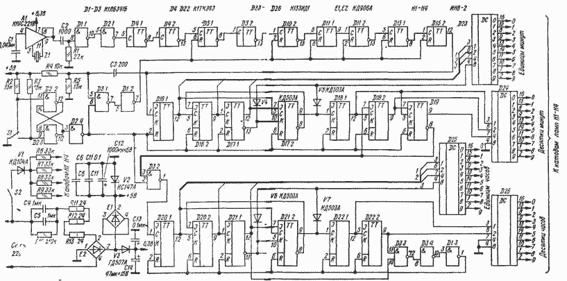 Делитель D5-D15 рассчитывают так, чтобы на его выходе образовывался, один импульс в минуту. Импульсы с выхода делителя подаются на вход счетчика минут D16-D17 и далее на счетчики десятков минут D18-D19, единиц часов D20-D21, десятков часов D22. Коэффициент пересчета счетчика часов, равный 24, получают с помощью элементов D3.3, D3.4 и D1.3.